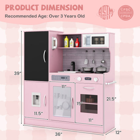 Corner Wooden Play Kitchen with Lights and Sounds Large Pretend Play Kitchen Set-Pink