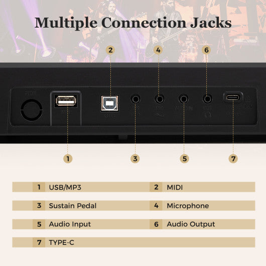 ●Wireless Connection & MIDI Function: To boost your music creativity you can seamlessly connect this portable keyboard with other MIDI devices wirelessly. Besides it is equipped with multiple connection jacks including USB/MP3 MIDI sustain pedal microphone audio input audio output and TYPE-C.