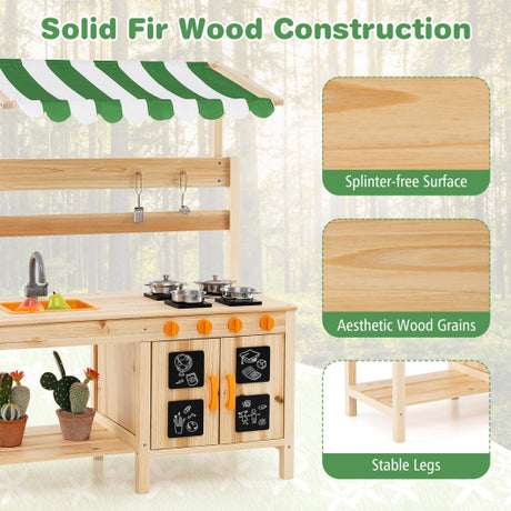 Mud Kitchen Fir Wood Play Kitchen with Canopy and Sink and 4 Stoves-Natural
