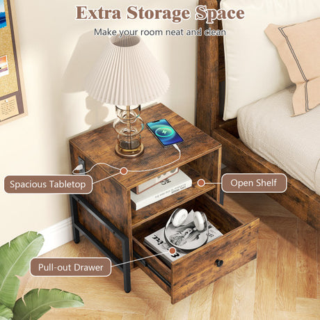 Nightstand with Charging Station and Drawer Sofa Side Table-Rustic Brown