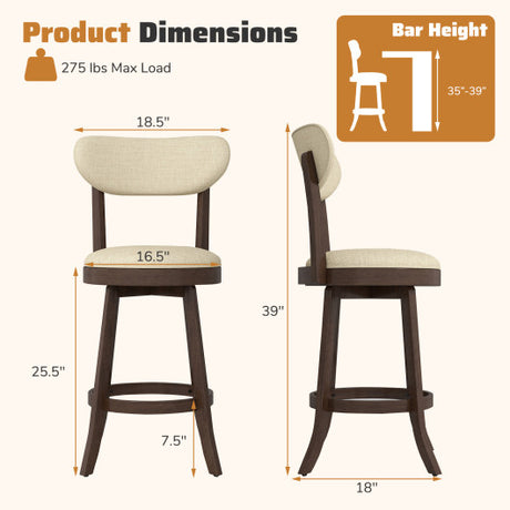 30.5 Inch Bar Height Chairs Set of 2 Swivel High Barstool with Padded Seat and Backrest-Brown