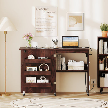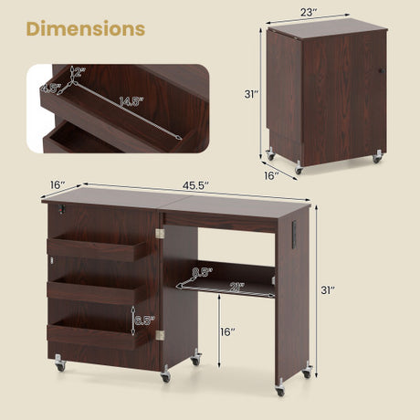 Sewing Machine Table with Charging Station and Lockable Casters-Brown