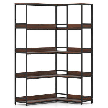 Corner Bookshelf 5-Tier L-Shaped Bookcase Etagere Bookshelf with Metal Frame-Walnut