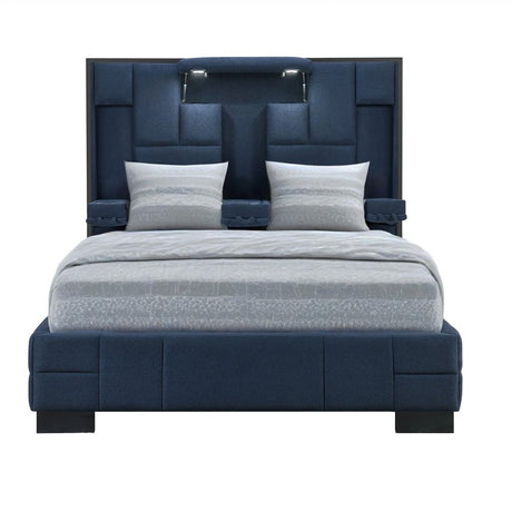 Navy Blue And Upholstered Lighted Queen Bed Frame with USB