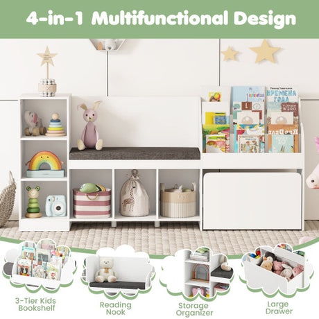 Kids Bookcase with Reading Nook 4-in-1 Standing Toy Organizer-White
