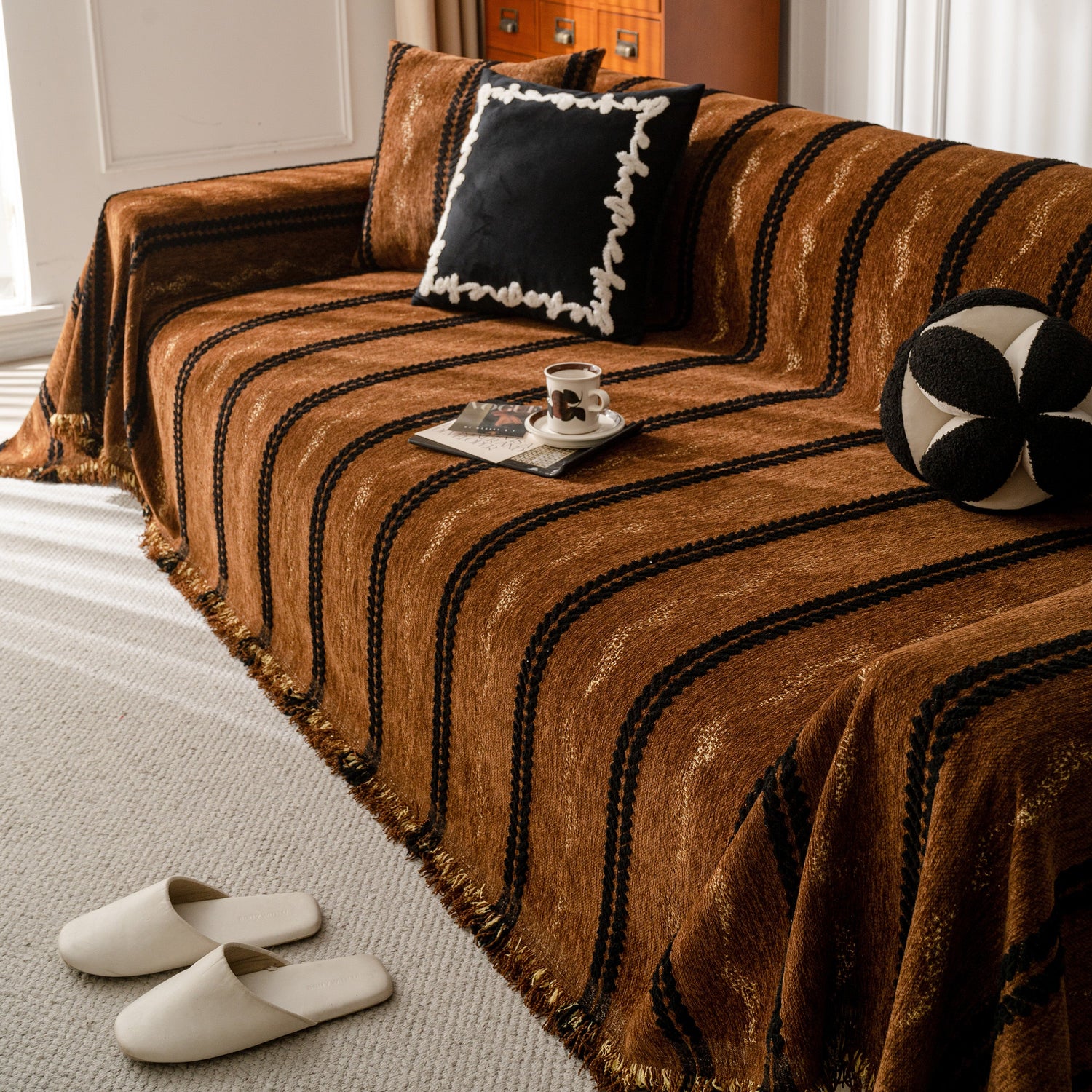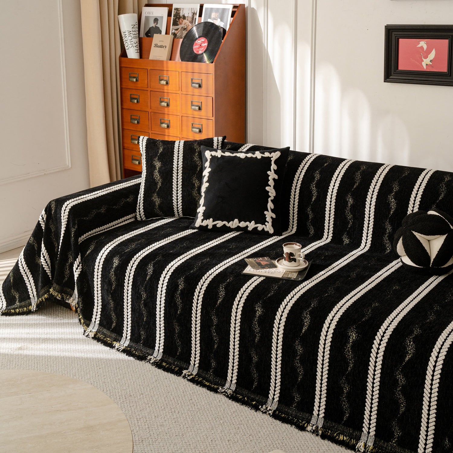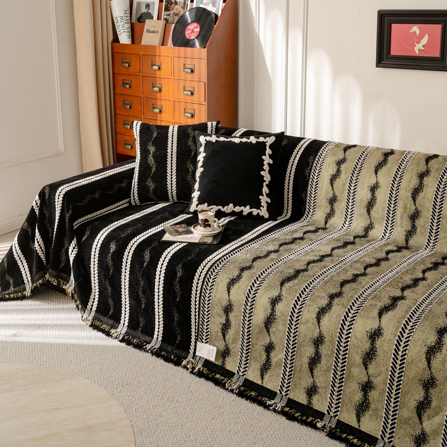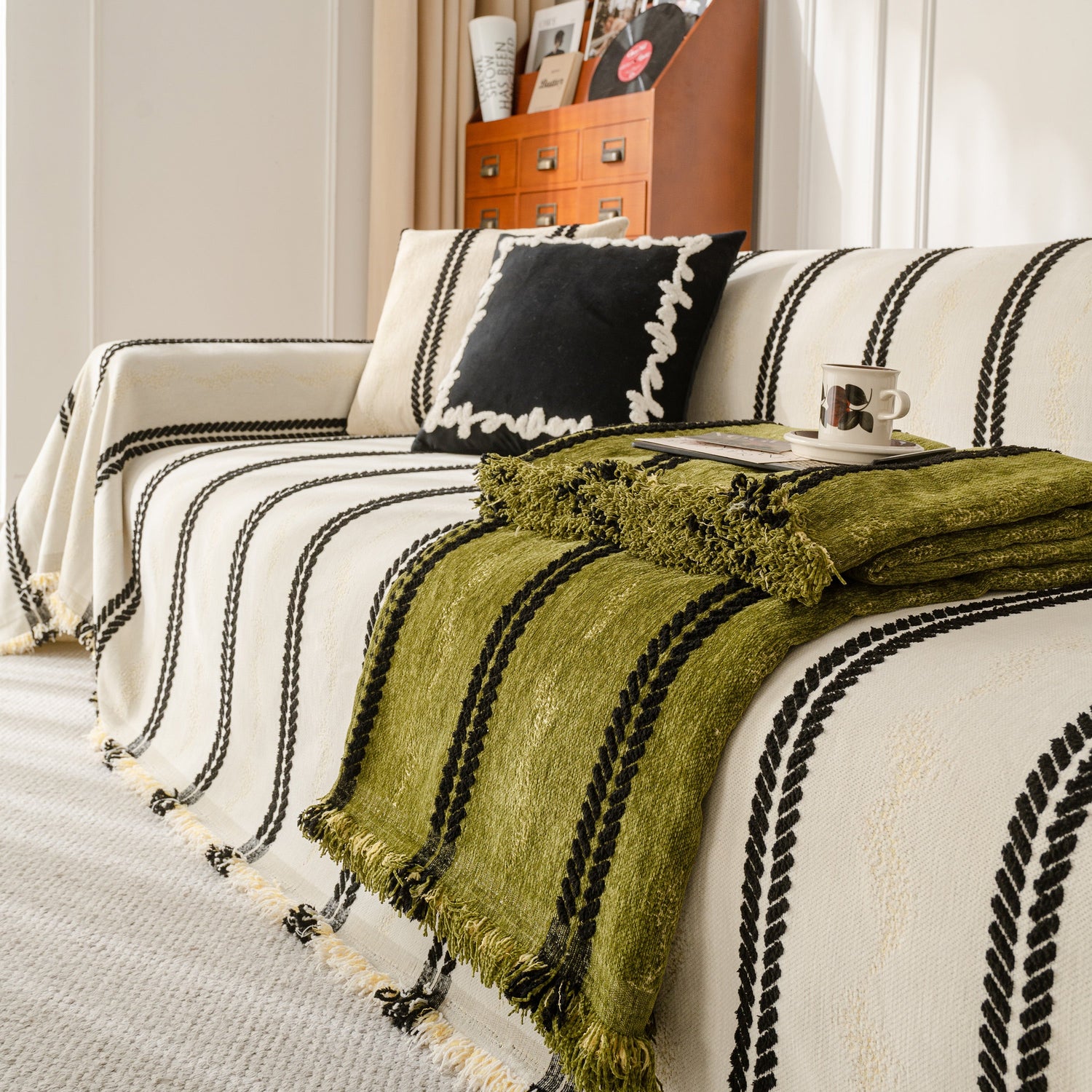 This boho-style sofa cover blanket is made from a woven fabric featuring textured stripes on a neutral base. The material is soft, breathable, and suitable for year-round use. It can be used as a decorative couch throw, a protective sofa cover, or a lightweight blanket.
