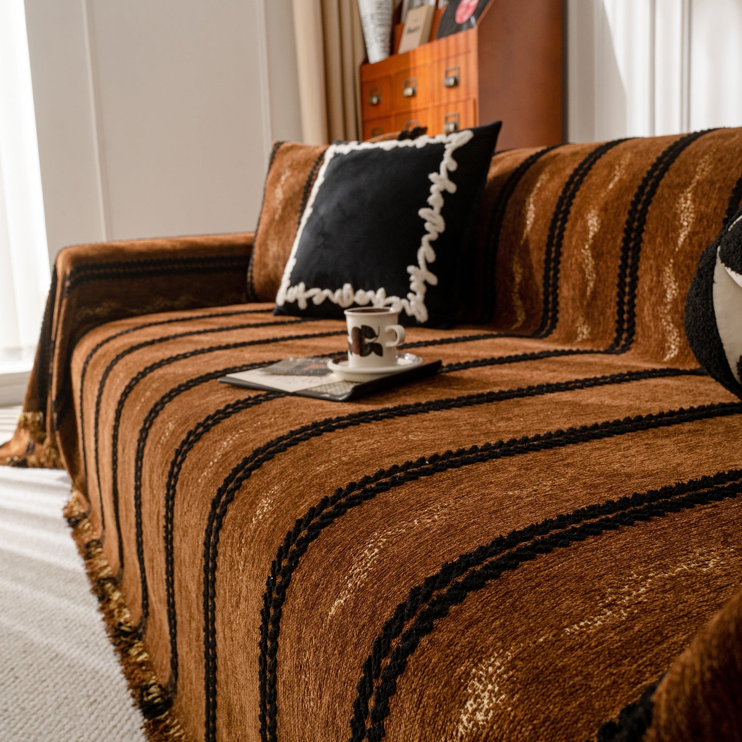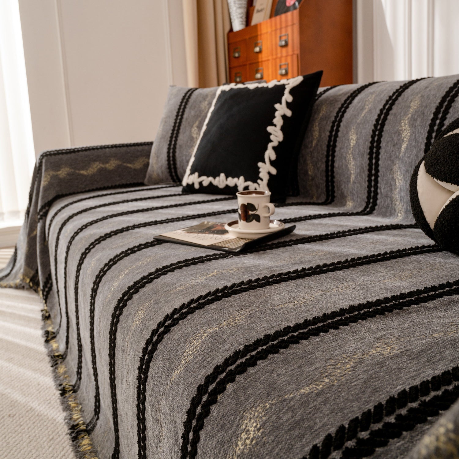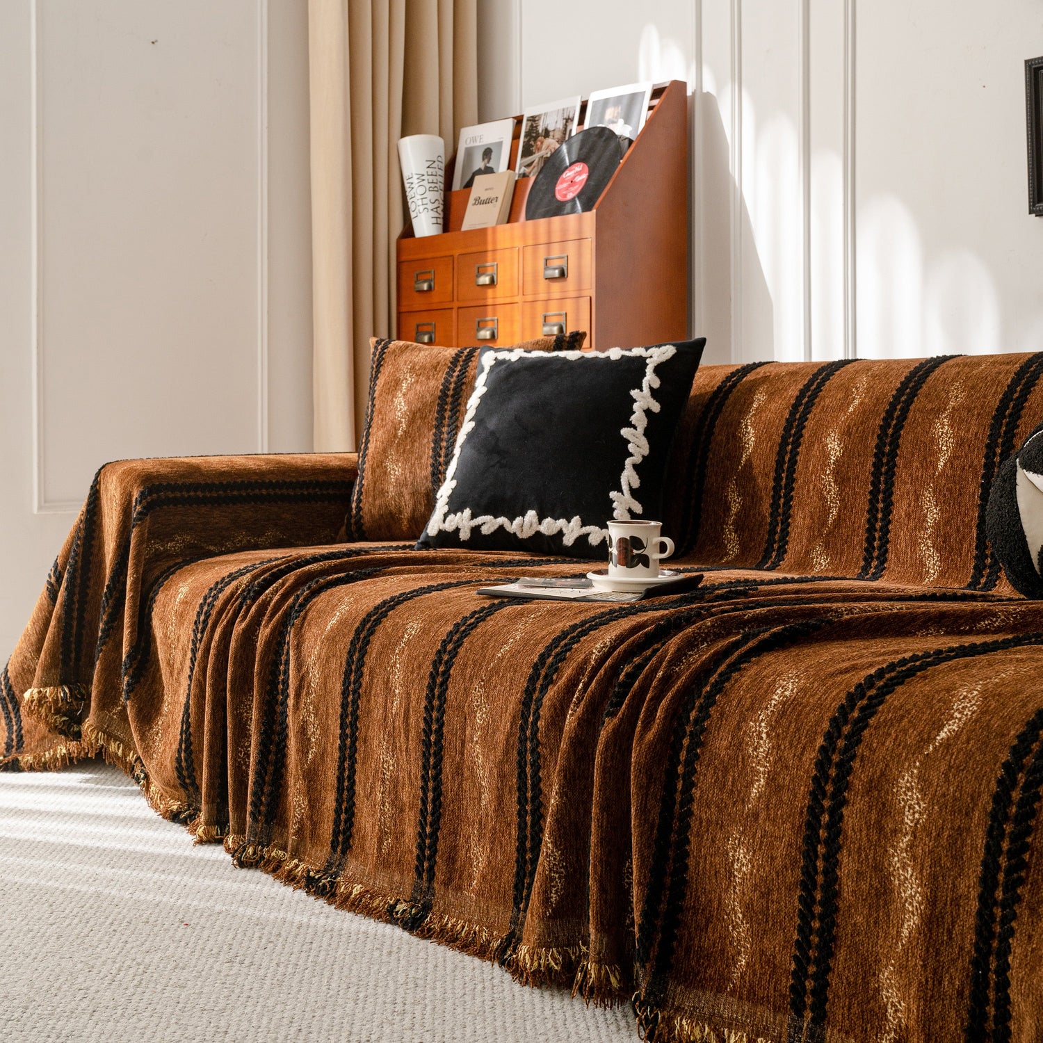 This boho-style sofa cover blanket is made from a woven fabric featuring textured stripes on a neutral base. The material is soft, breathable, and suitable for year-round use. It can be used as a decorative couch throw, a protective sofa cover, or a lightweight blanket.