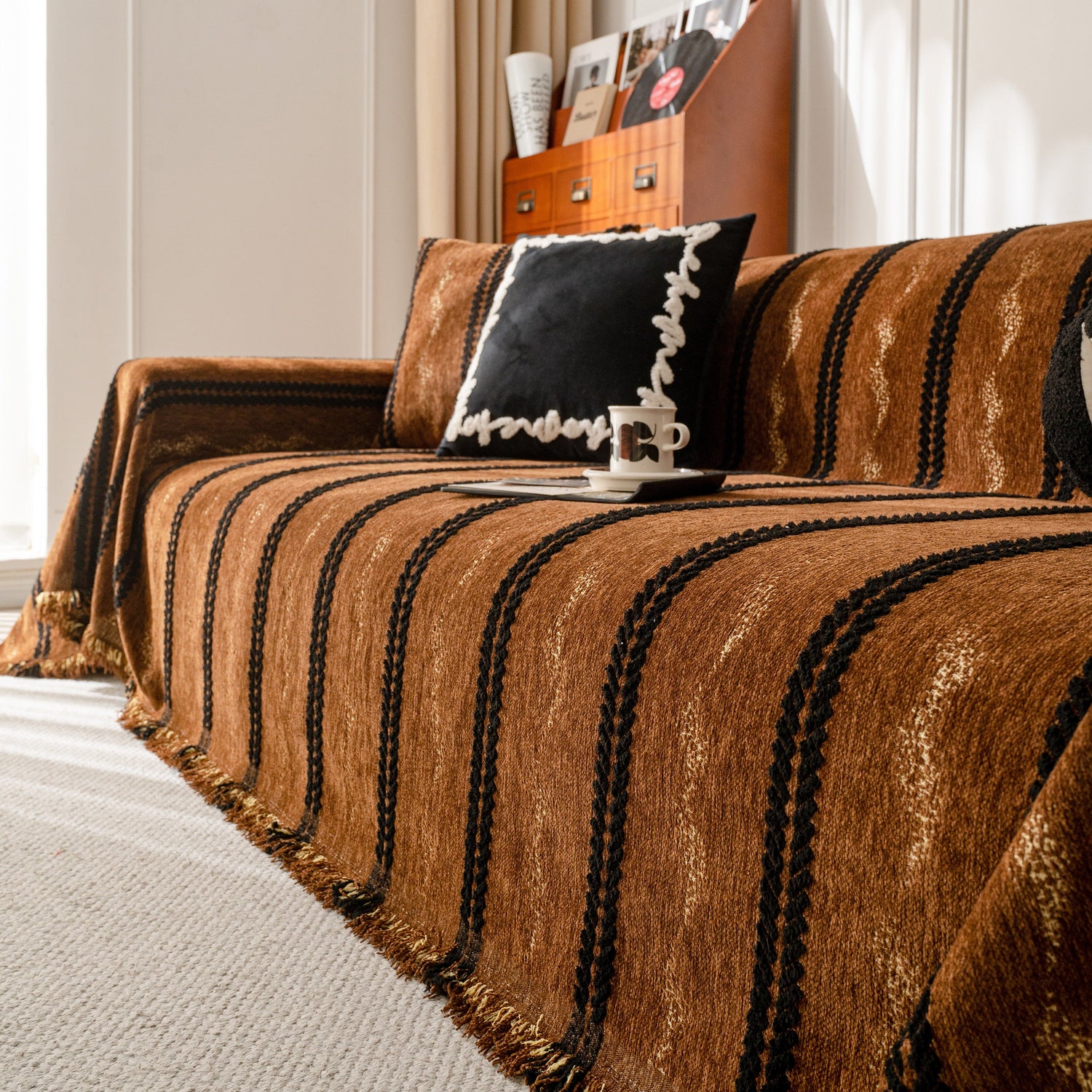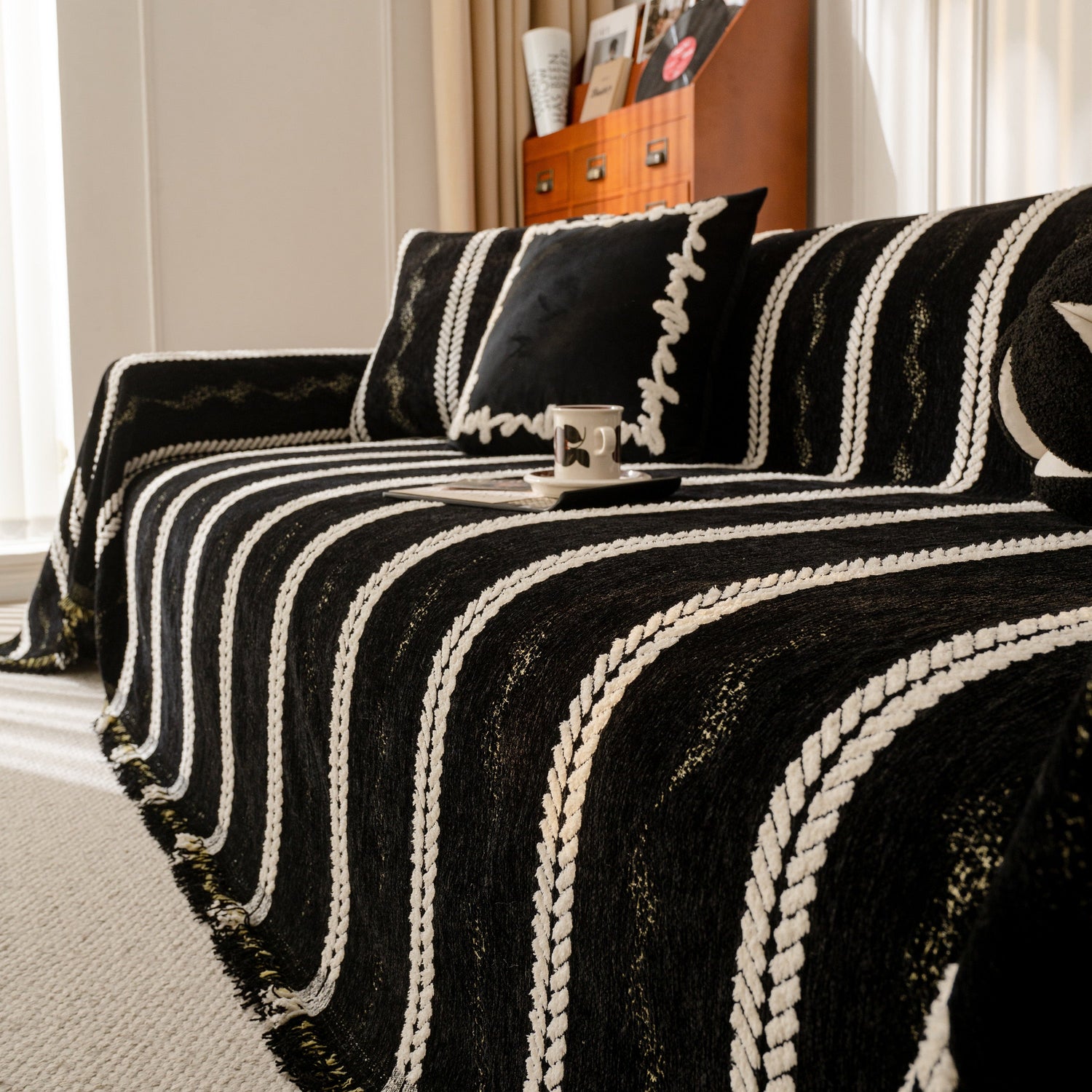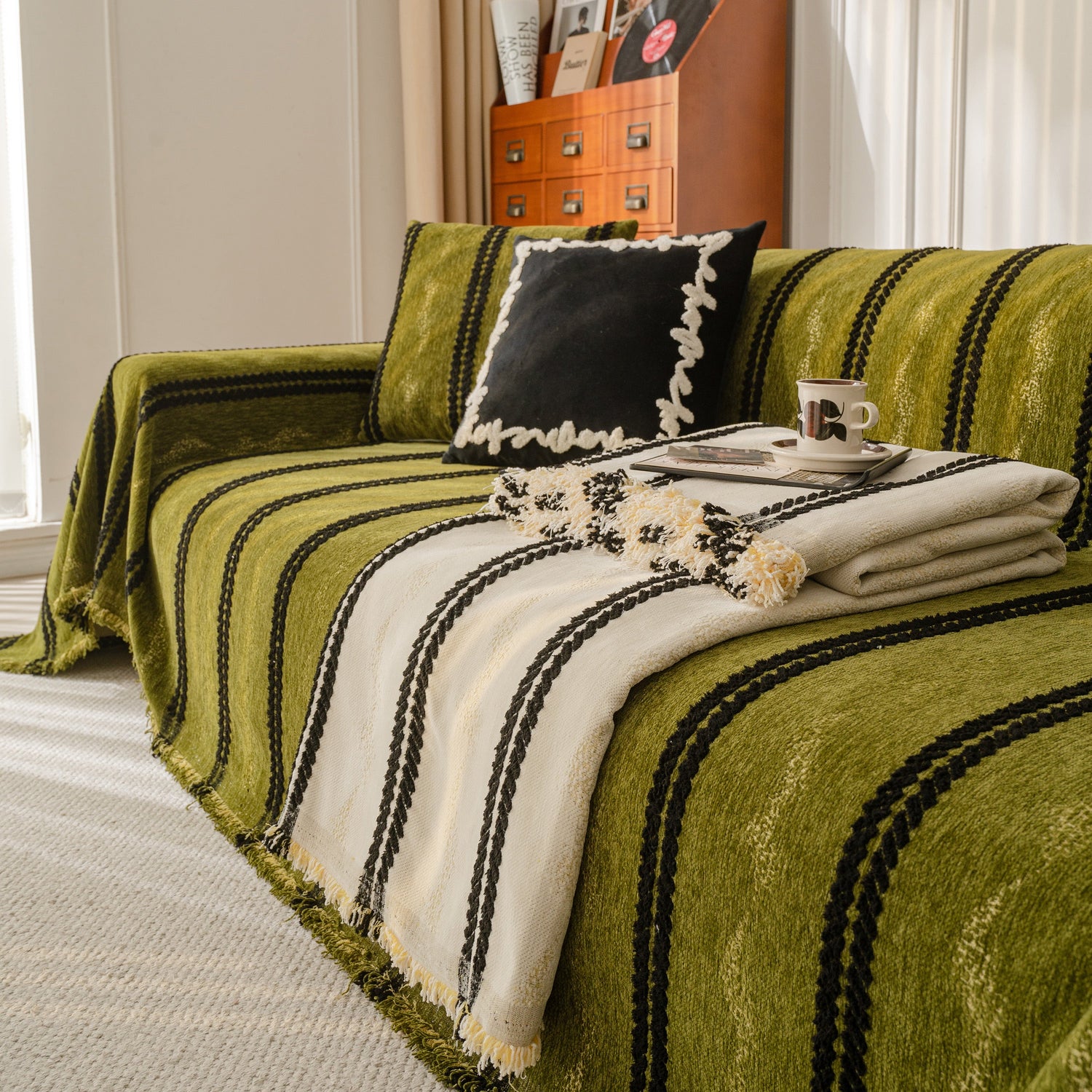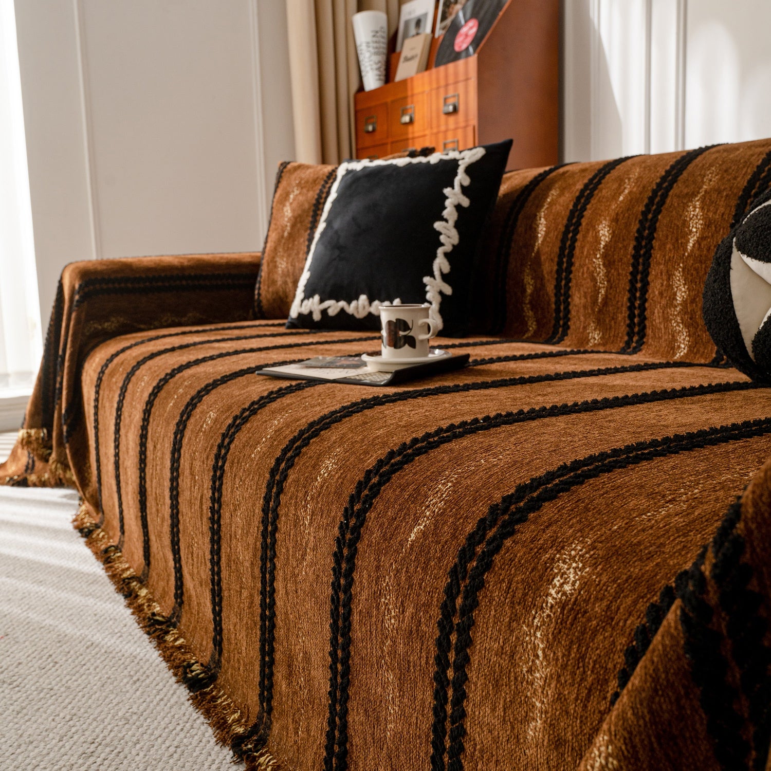 This boho-style sofa cover blanket is made from a woven fabric featuring textured stripes on a neutral base. The material is soft, breathable, and suitable for year-round use. It can be used as a decorative couch throw, a protective sofa cover, or a lightweight blanket.