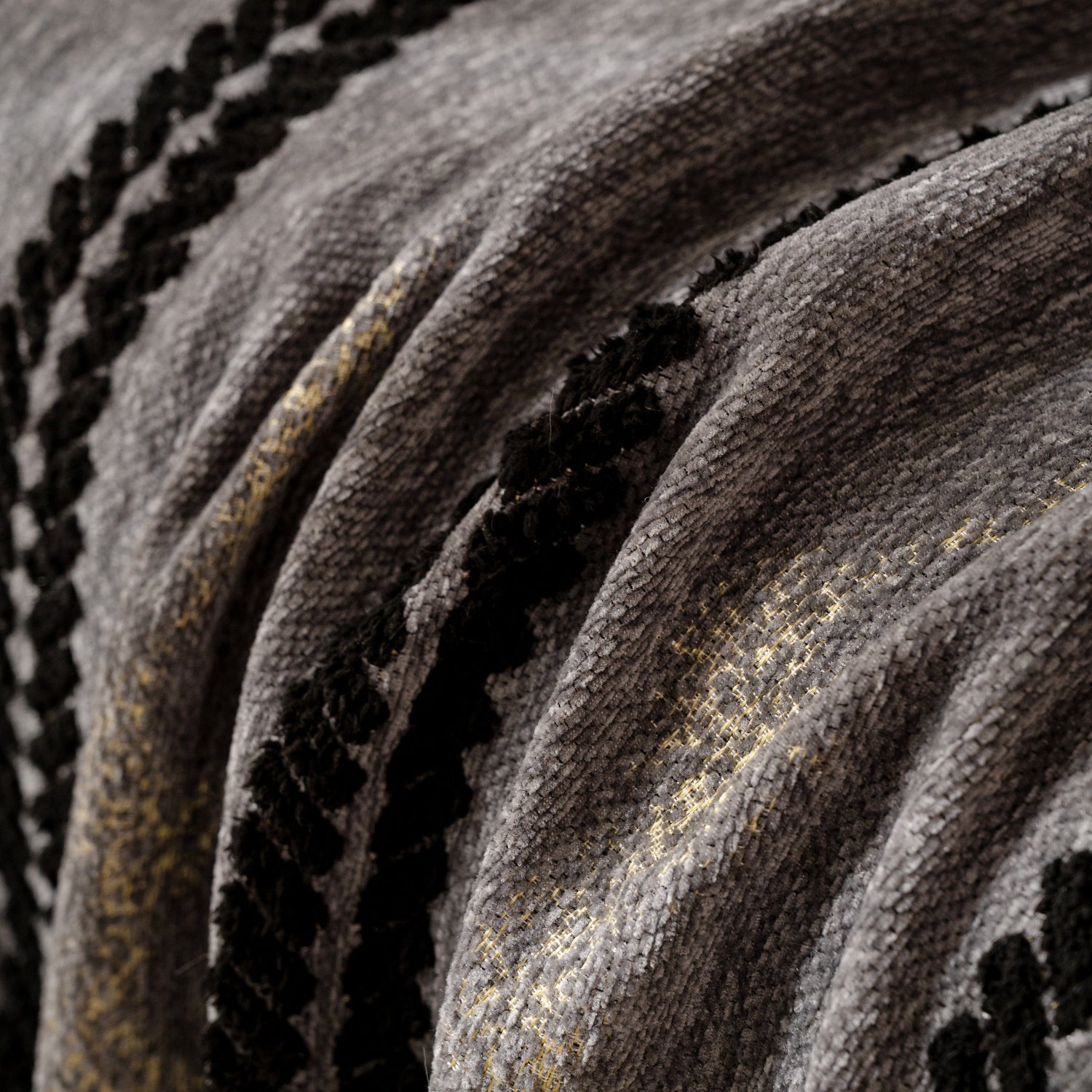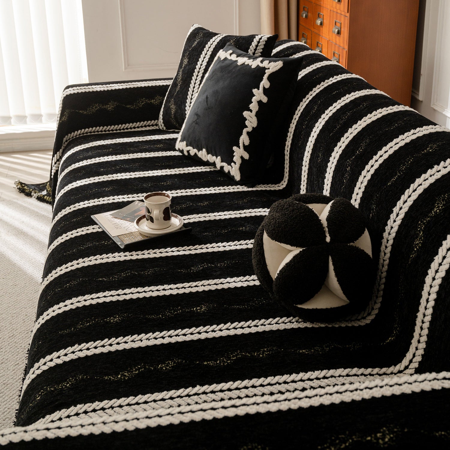 The stripe pattern is raised and textured, providing visual depth and a tactile contrast. The cover has a natural drape and is designed to fit a variety of sofa shapes and sizes. It is machine washable and easy to maintain.