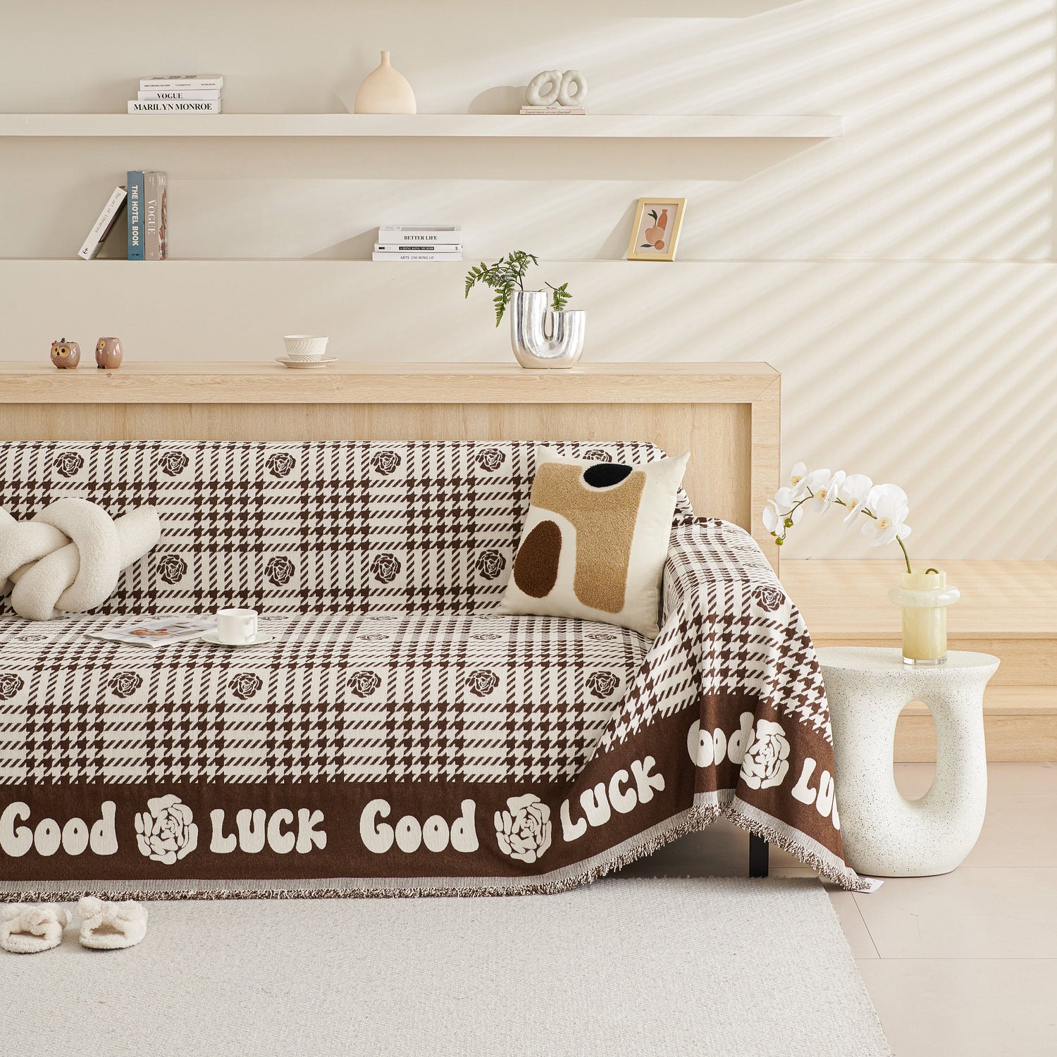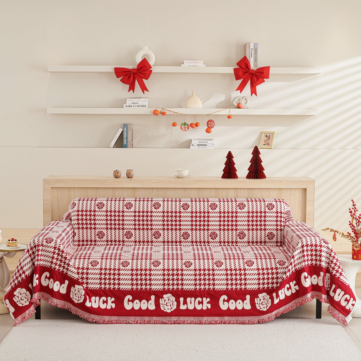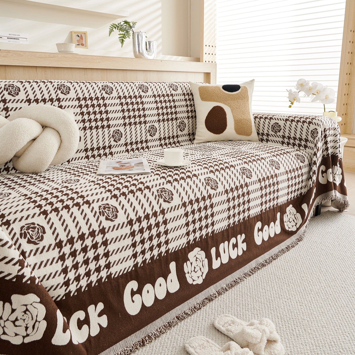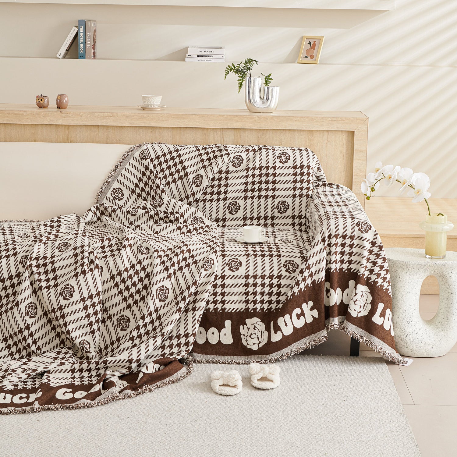 This throw blankets for couch is made from soft, durable chenille fabric with a plush, slightly raised texture. Featuring a classic houndstooth pattern combined with playful “Good Luck” lettering and floral motifs along the border, it adds charm and character to any living space. The thick yet breathable fabric makes it suitable for year-round use.