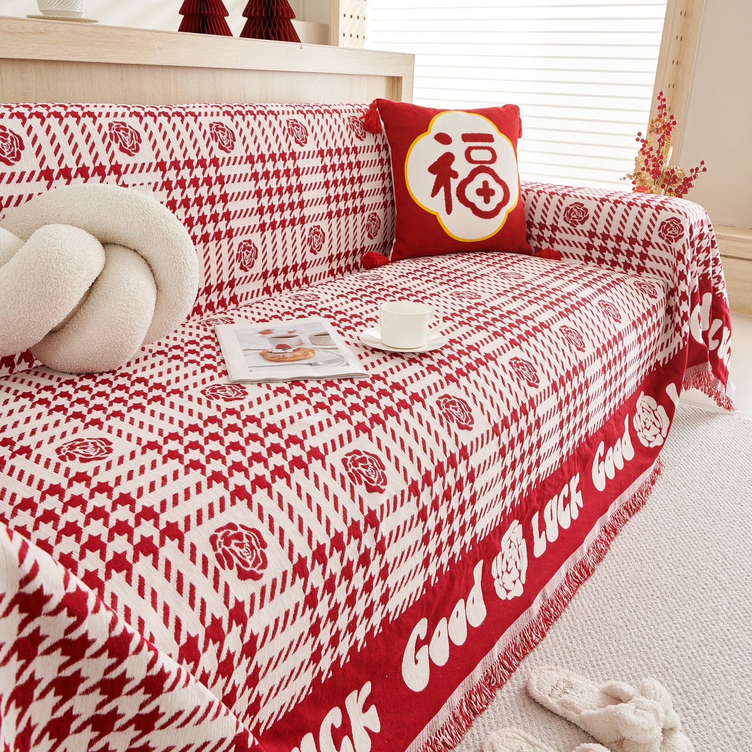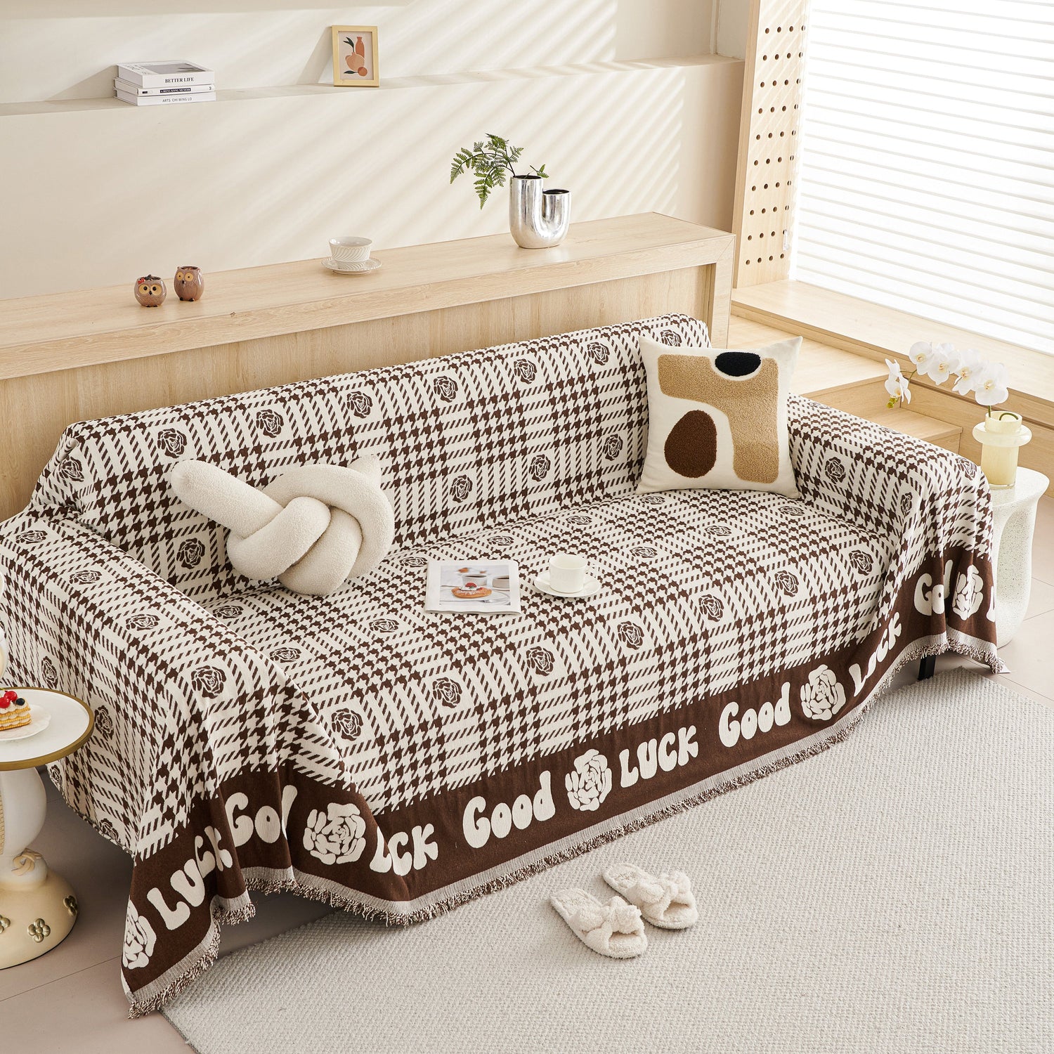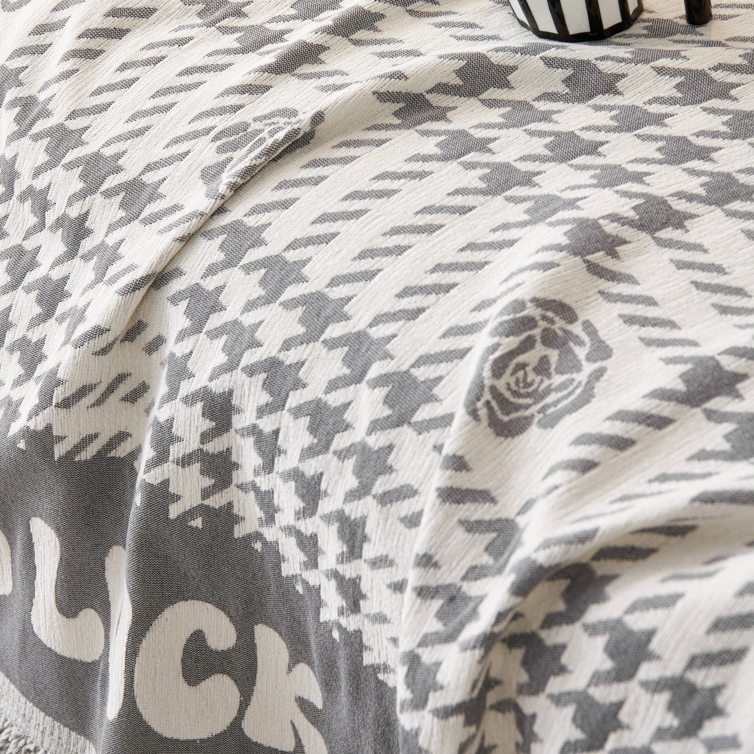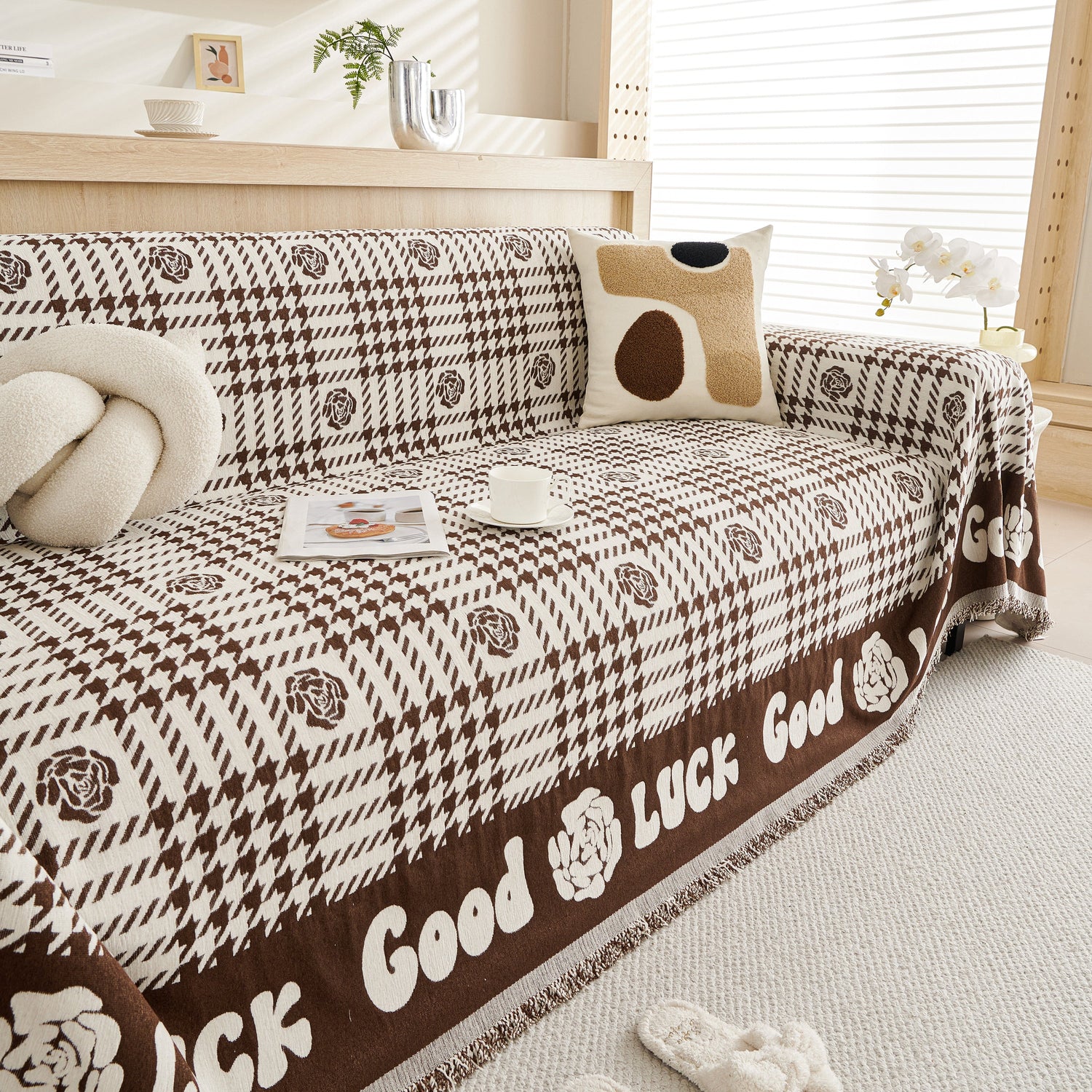 This throw blankets for couch is made from soft, durable chenille fabric with a plush, slightly raised texture. Featuring a classic houndstooth pattern combined with playful “Good Luck” lettering and floral motifs along the border, it adds charm and character to any living space. The thick yet breathable fabric makes it suitable for year-round use.
