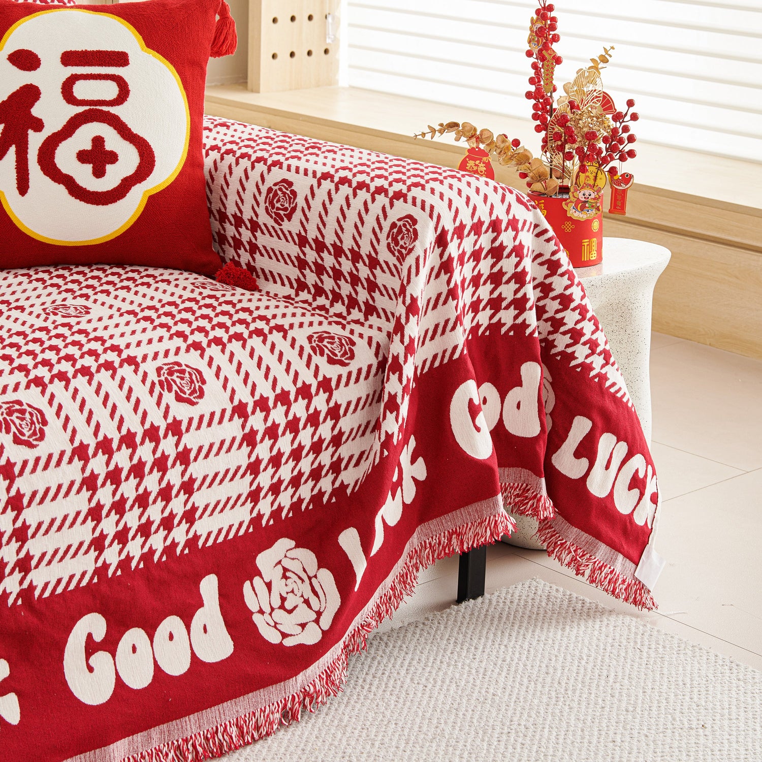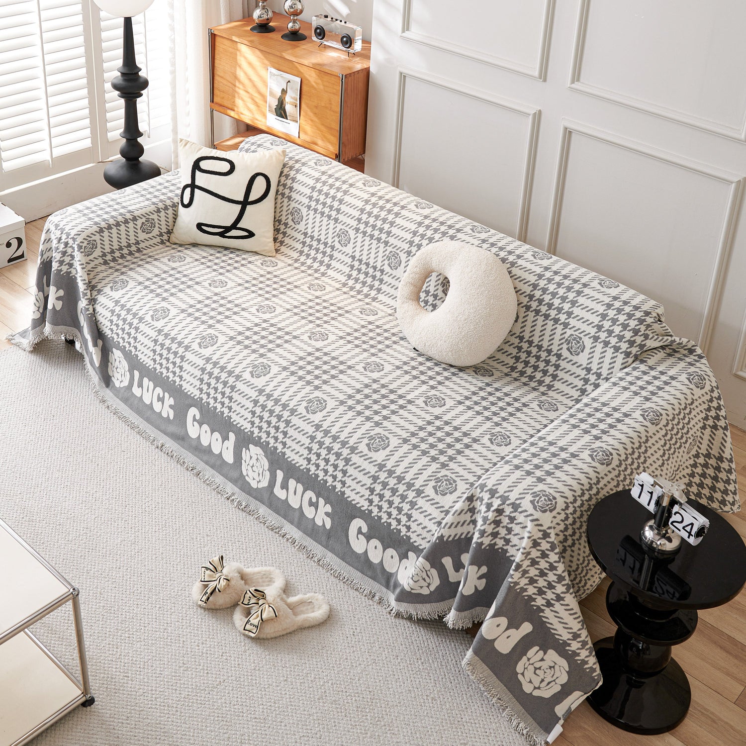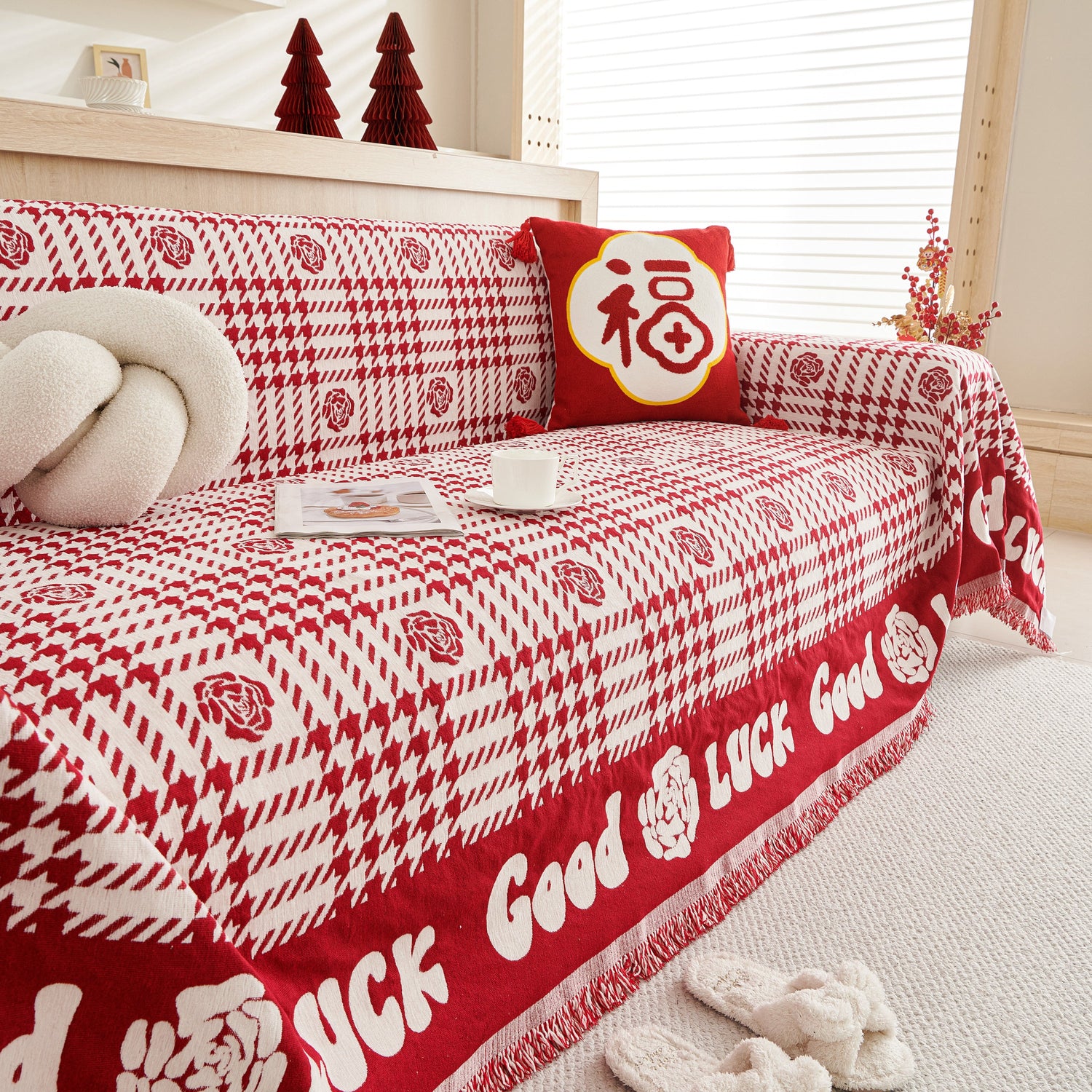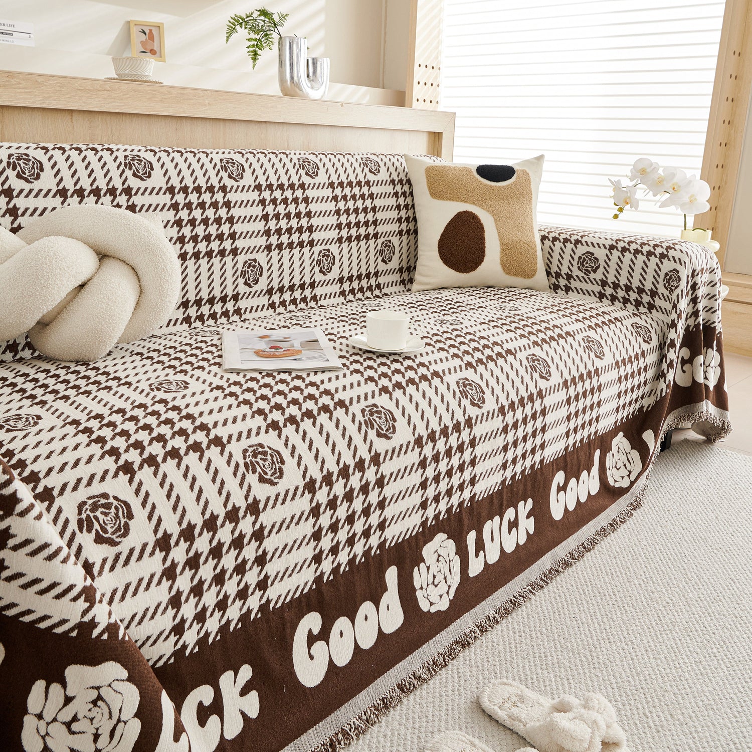 This throw blankets for couch is made from soft, durable chenille fabric with a plush, slightly raised texture. Featuring a classic houndstooth pattern combined with playful “Good Luck” lettering and floral motifs along the border, it adds charm and character to any living space. The thick yet breathable fabric makes it suitable for year-round use.