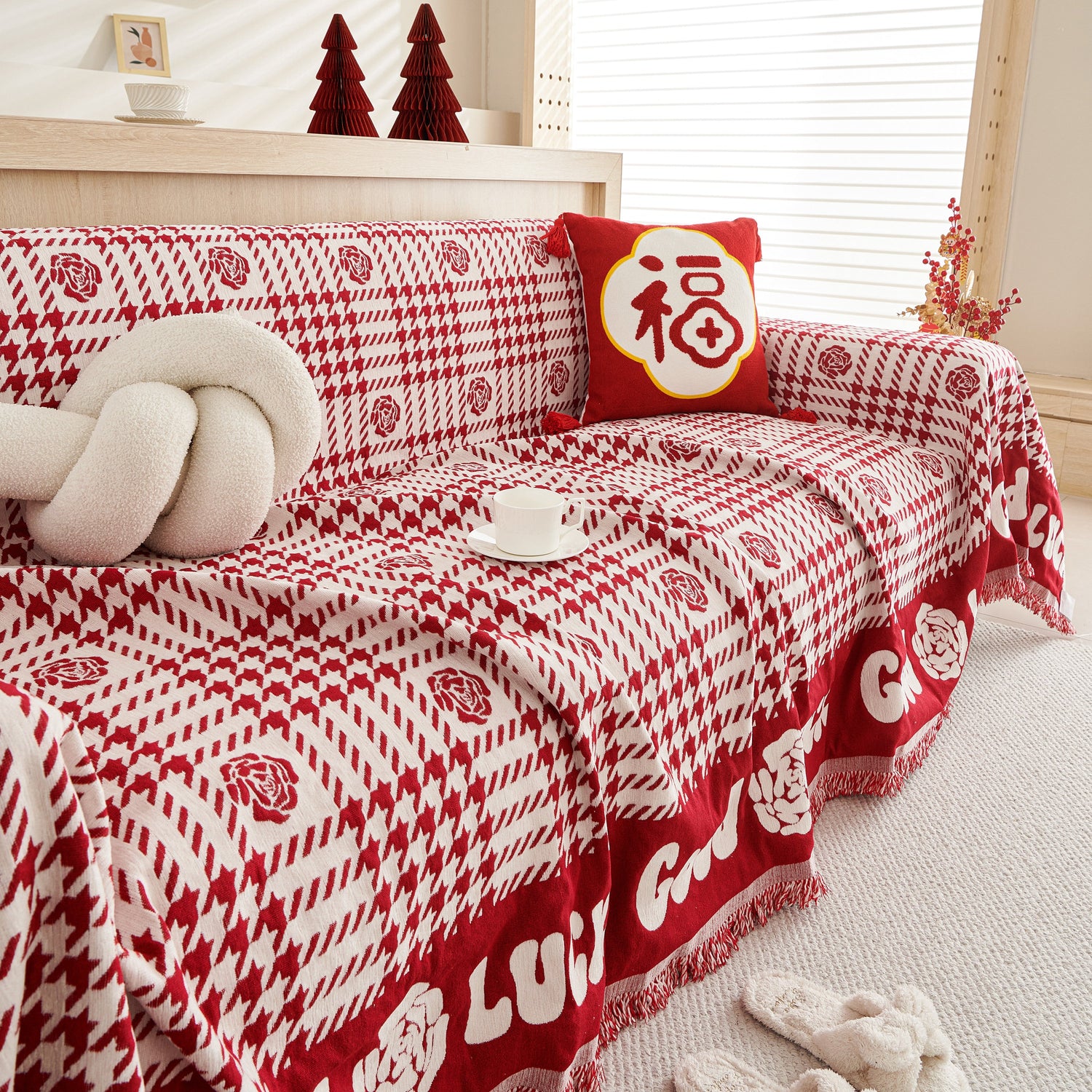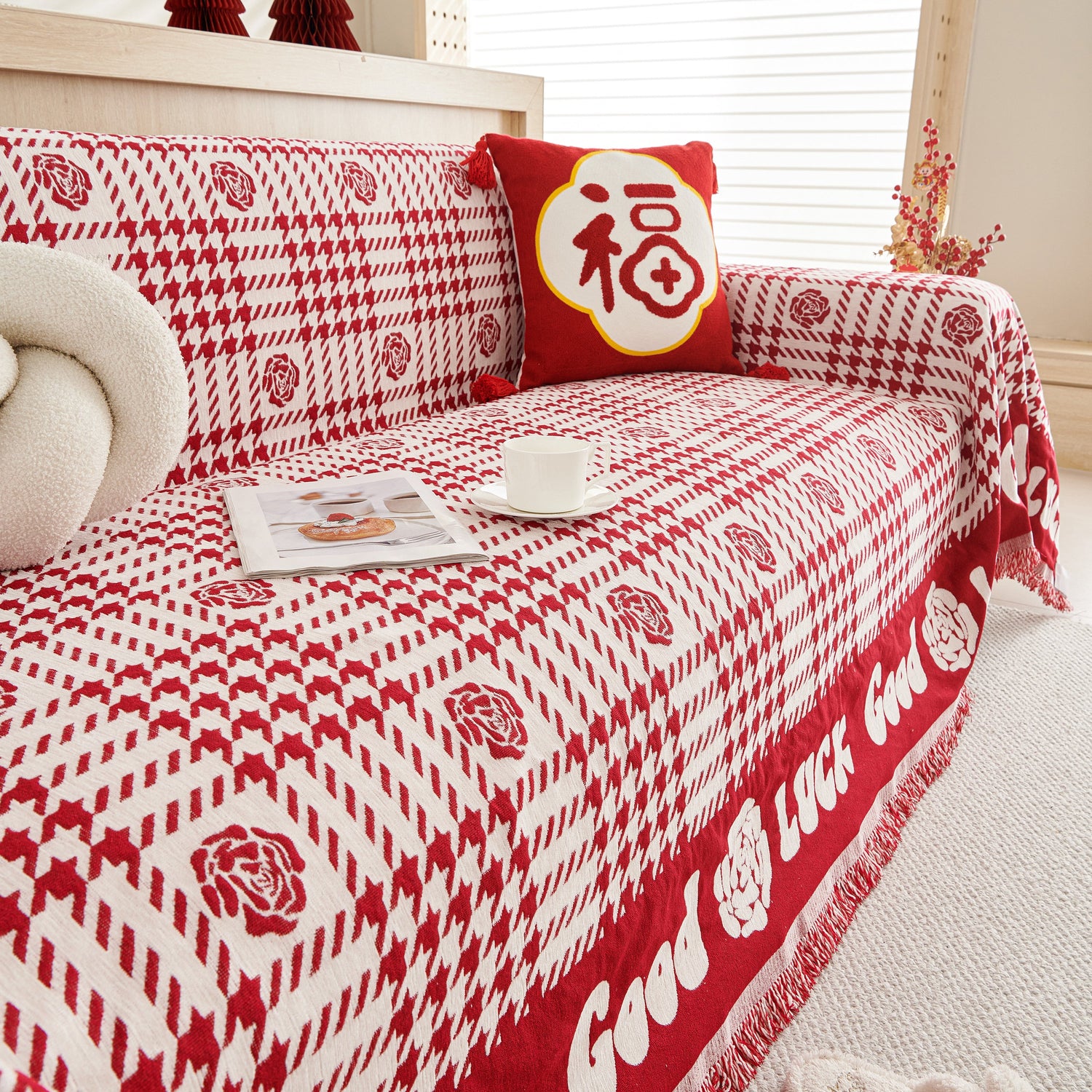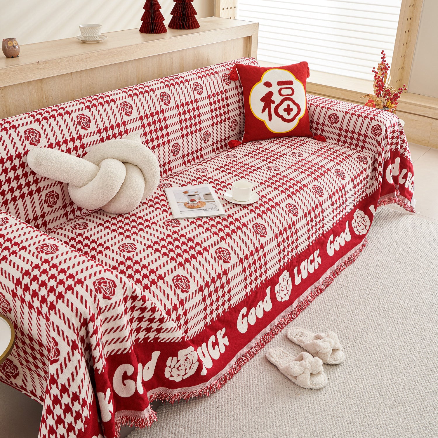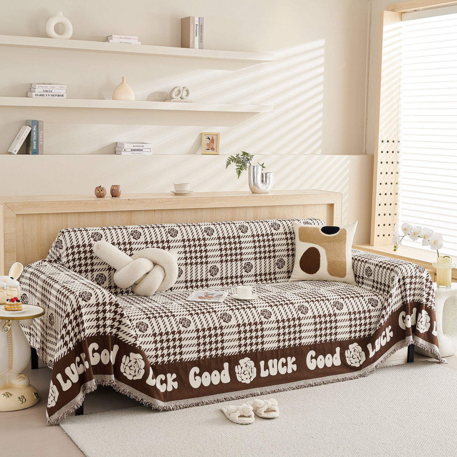 This throw blankets for couch is made from soft, durable chenille fabric with a plush, slightly raised texture. Featuring a classic houndstooth pattern combined with playful “Good Luck” lettering and floral motifs along the border, it adds charm and character to any living space. The thick yet breathable fabric makes it suitable for year-round use.