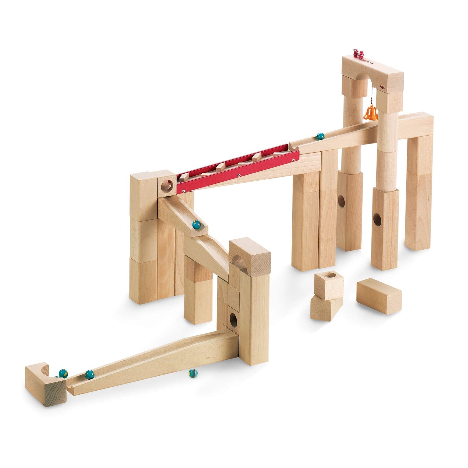 Includes: 1 zigzag track, 1 bridge with bell, 4 redirection blocks, 2 tunnel blocks, 4 ramps, 14 rectangular blocks, 8 square blocks, 2 bridging blocks, 6 columns, 6 marbles. Includes instruction booklet.