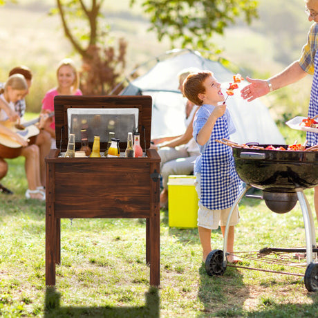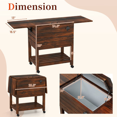 54 Quart Wooden Cooler Cart for Patio Rolling Ice Chest with Shelves-Brown