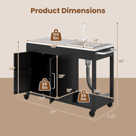 56 Inches Outdoor Grill Table with Sink and Stainless Steel Top-Black