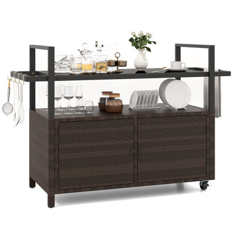 Outdoor Bar Cart Wicker Buffet Serving Cart with Cabinet and 8 Hooks-Brown