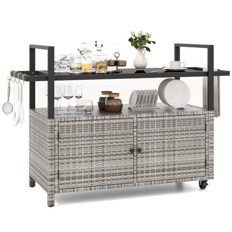 Outdoor Bar Cart Wicker Buffet Serving Cart with Cabinet and 8 Hooks-Gray