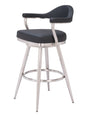 30" Black And Silver Faux Leather And Stainless Steel Bar Height Swivel Bar Chair