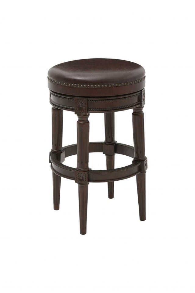 31" Brown Faux Leather and Solid Wood Backless Counter Height Swivel Bar Chair is backordered and will ship as soon as it is back in stock.