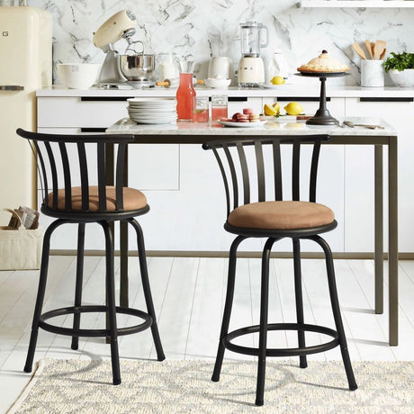 Set of Two 24" Brown and Black Microfiber and Metal Low Back Counter Height Swivel Bar Chairs