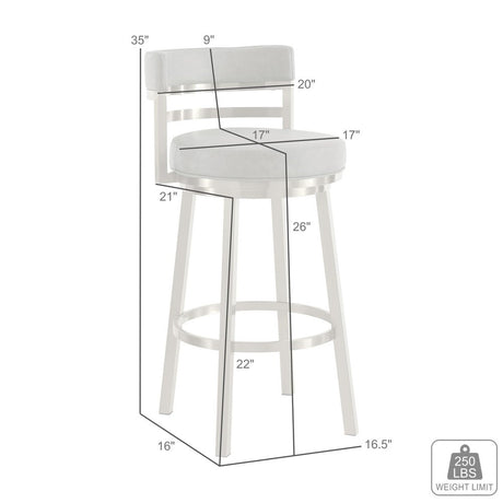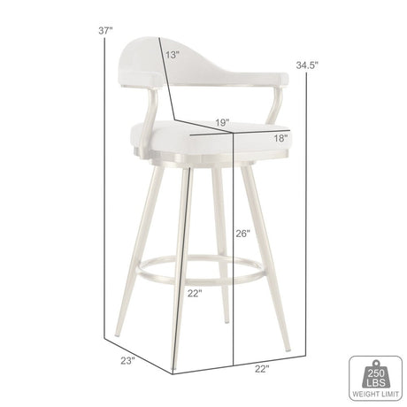 31" White And Silver Faux Leather And Stainless Steel Bar Height Swivel Bar Chair