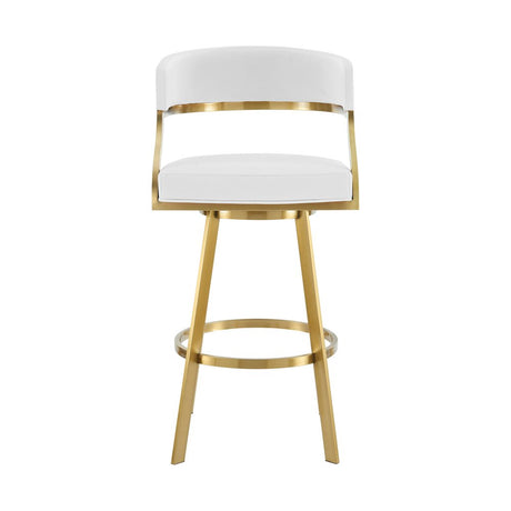 30" White and Gold Faux Leather and Stainless Steel Low Back Bar Height Swivel Bar Chair