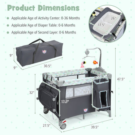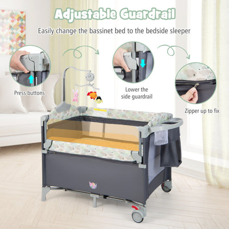 5-in-1 Portable Baby Beside Sleeper Bassinet Crib Playard with Diaper Changer-Gray