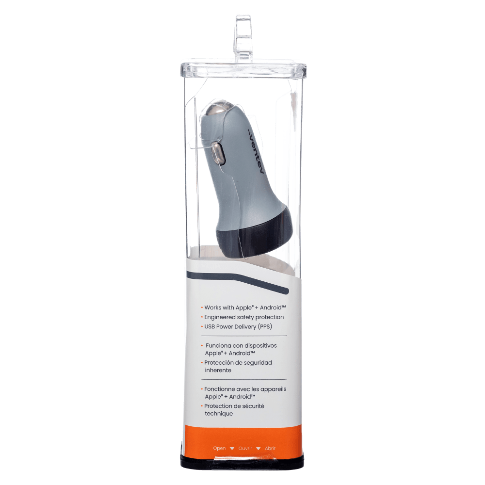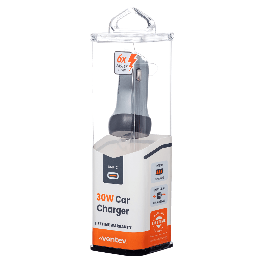 The Ventev 30W USB-C PPS Car Charger features universal fast charging for any USB-C device. Charge an iPhone 14 in less than 30 minutes. ThatÕs 6x faster than the standard Apple 5W charger. Features LED charging port that turns off after a few seconds for distraction free driving. Backed by Ventev's industry-leading Limited Lifetime Warranty.