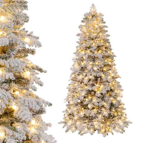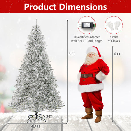 8 Feet Snow-flocked Artificial Christmas Tree Pre-lit Hinged Xmas Tree with Warm White LED Lights