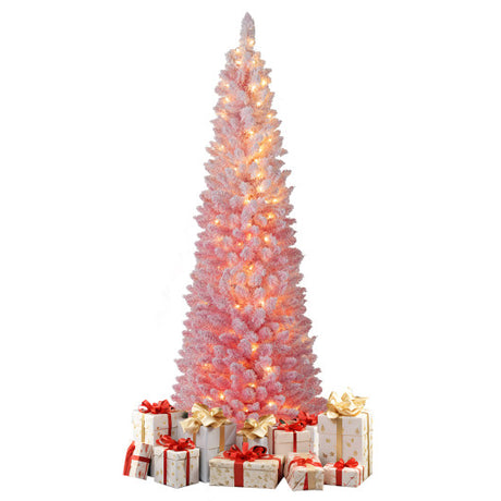 7 FTSnow-flocked Artificial Pink Christmas Tree Pre-lit Hinged Xmas Tree for Holiday Decoration