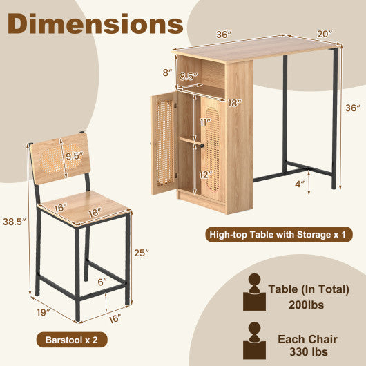 3-Piece Bar Table and Chairs Set with Storage Shelves and Footrests-Natural