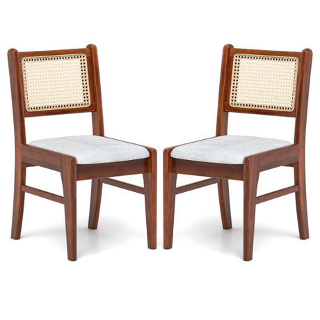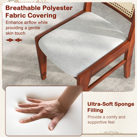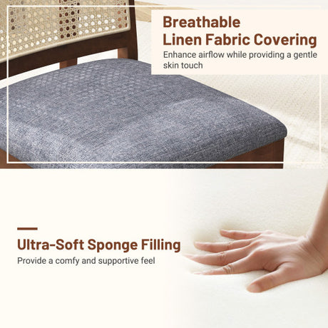 Rattan Dining Chair Set of 2 with Rubber Wood Frame and Linen Fabric Padded Seat-Walnut