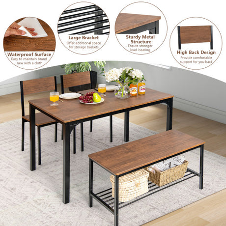 4 Piece Dining Table Set with Bench and 2 Chairs-Brown