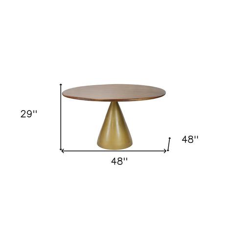 48" Brown And Gold Rounded Solid Wood And Iron Pedestal Base Dining Table