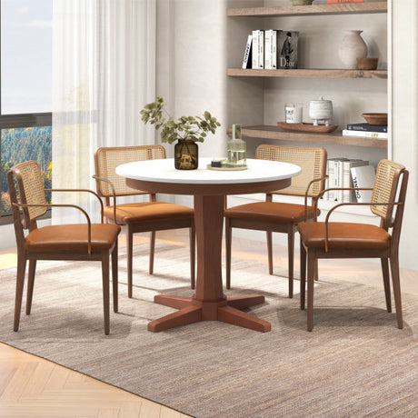 35 Inch Round Dining Table with Rubber Wood Legs and Marble-textured Veneer Tabletop-Brown