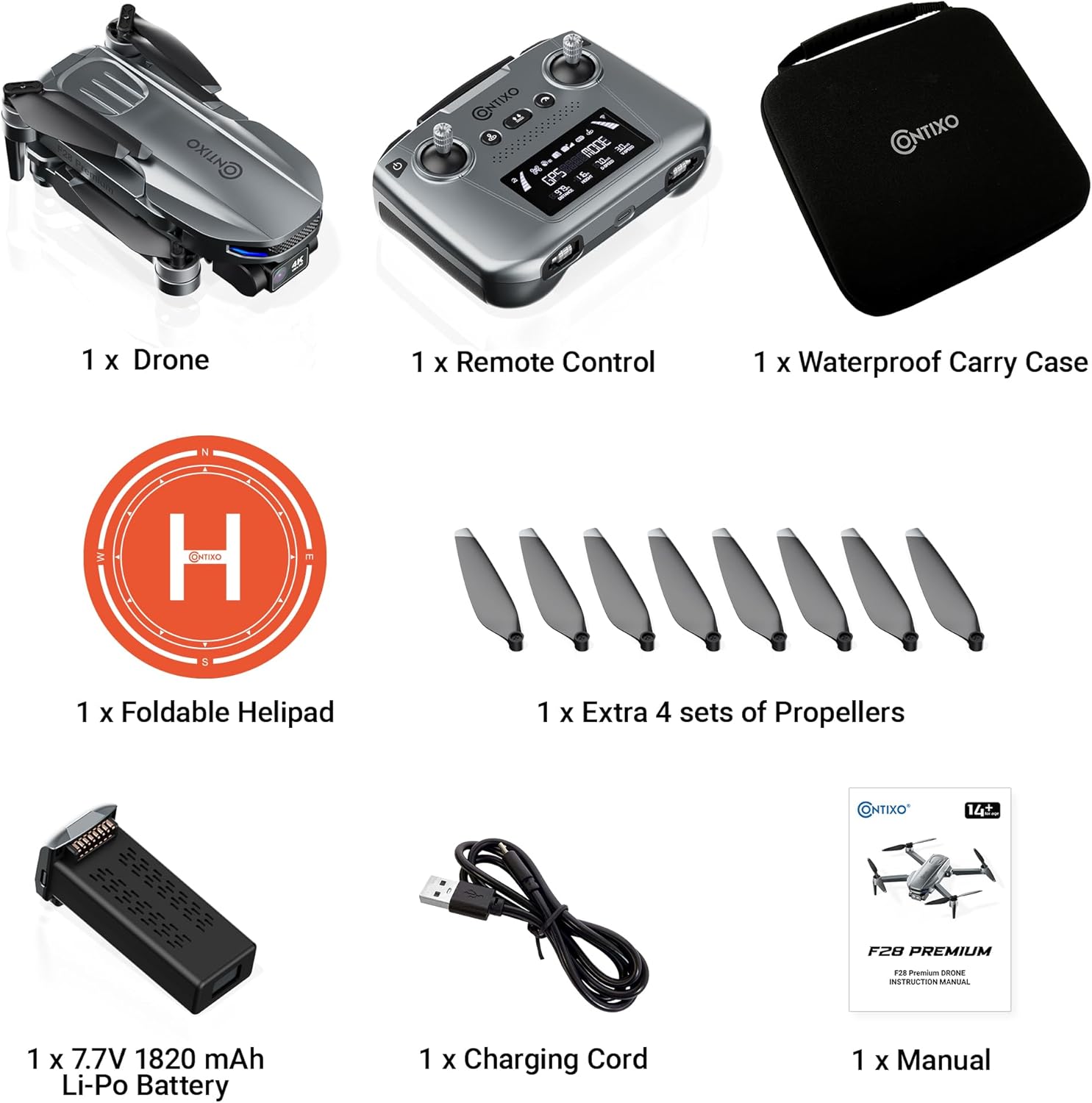 - 4K UHD CAMERA WITH WIDE-ANGLE LENS: The Contixo 4K gimbal camera mini drone has capture stunning, high-definition footage with the Contixo F28 Premium drone-s 4K UHD camera, featuring a resolution of 3840 x 2160 pixels. The built-in 110- wide-angle lens ensures a broader view, perfect for capturing sweeping landscapes or dynamic action shots. The lens also features a 70- adjustable angle, allowing you to fine-tune your shot and achieve the perfect composition every time."a-spacing-mini">2-AXIS GIMBAL WITH EIS ANTI-SHAKE: You can experience ultra-smooth and stable video recordings thanks to the 2-axis gimbal drones with Electronic Image Stabilization (EIS) on the Contixo F28 Premium. This sophisticated stabilization system effectively minimizes vibrations and shakes, ensuring that your footage remains clear and steady, even in challenging flying conditions or during high-speed maneuvers.