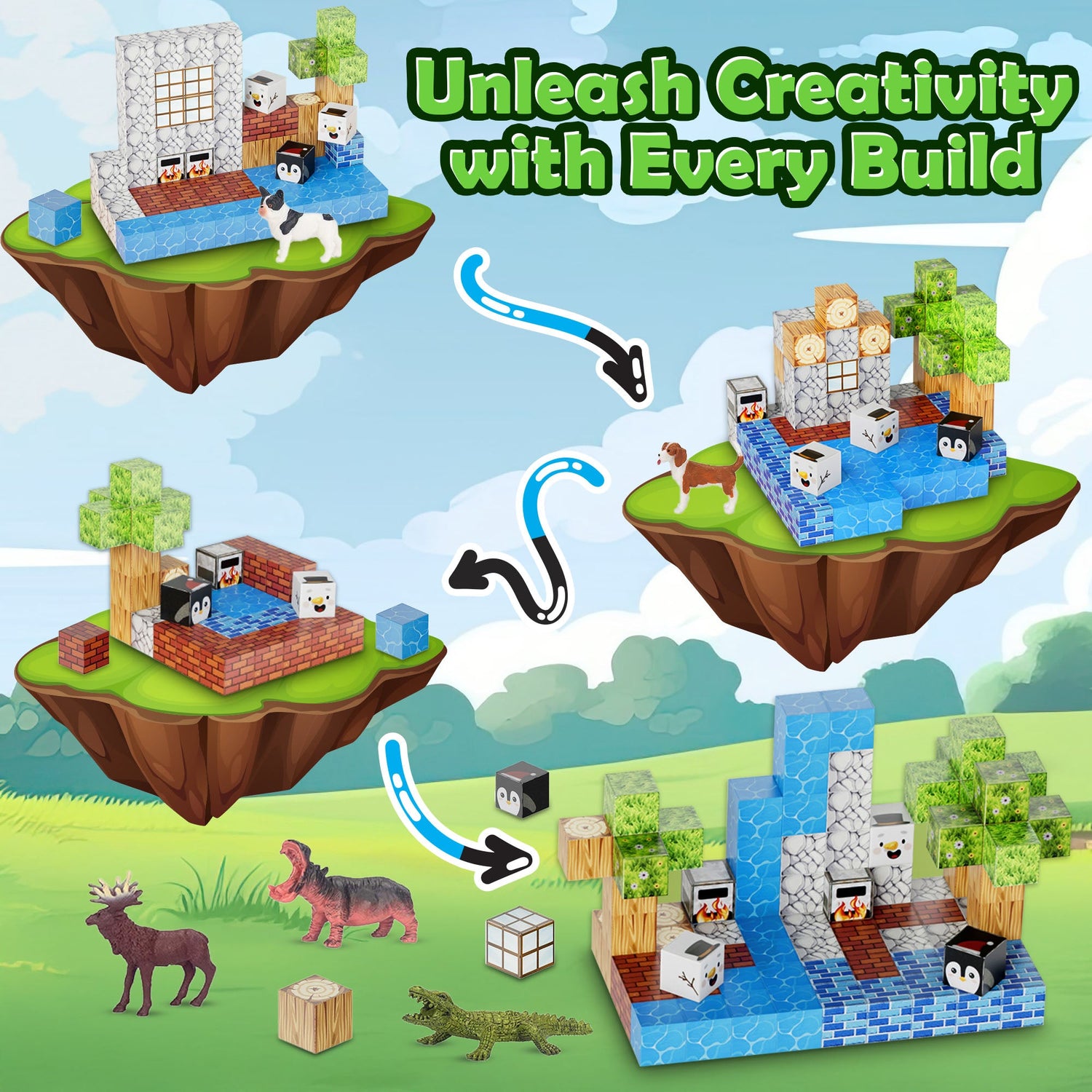 Let your child's creativity shine with this 100-piece Magnetic Building Cube Set! Each 1-inch magnetic cube features strong internal magnets and UV-printed designs on all six sides, allowing kids to build freely in every direction. The set includes 90 magnetic blocks and 10 adorable animal figures to spark storytelling, character play, and immersive learning. Built with ultrasonic welding, these cubes are durable and safe designed to handle active play without cracking. With endless ways to connect and create, kids can build animals, buildings, scenes, and more while developing critical thinking, fine motor skills, and hand-eye coordination. Perfect for boys and girls ages 3 to 12, this magnetic toy set makes a thoughtful gift for birthdays, holidays, school rewards, or classroom use.
