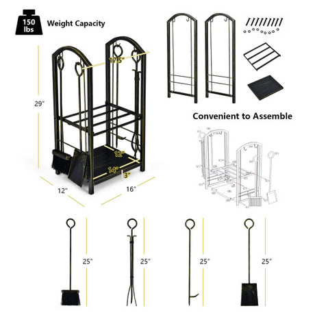 Fireplace Log Rack with 4 Pieces Fireplace Tools-Bronze
