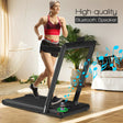 This electric treadmill with remote control provides 2 modes for your selection. One is walking motion (0.6 - 2.5 mph) and another is running motion (0.6 - 9 mph). Meanwhile there is an LED touch screen on the top and an LED display window at the bottom. Therefore you are able to walk or run conveniently. Besides the 5-layer anti-slip running belt and 2.25HP powerful motor make this running machine safe and noiseless. What's more you can connect to the Gymax APP via Bluetooth to explore different functions. Likewise the phone holder and Bluetooth speaker bring more interest while training. After exercising you can fold the treadmill into a compact size and move it easily with 2 built-in wheels.
