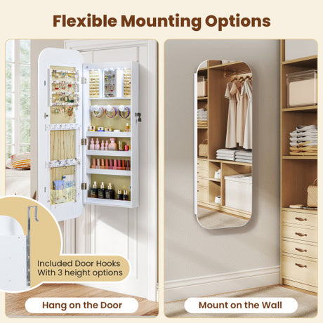 6 LEDs Mirror Jewelry Cabinet Wall or Door Mounted Lockable Jewelry Organizer-White