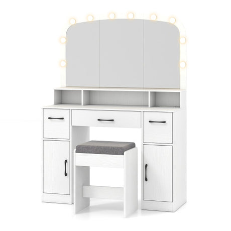 Vanity Desk Makeup Table with Stool 3-Color Lights and Charging Station-White