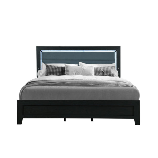 Black and Ash Gray Wood And Upholstery Lighted Upholstered Queen Bed Frame