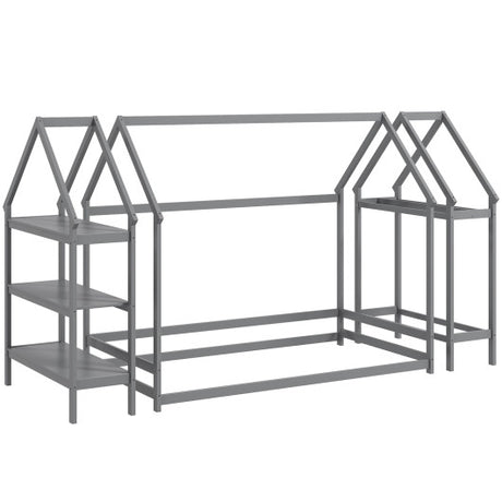 Twin Size Montessori Floor House Bed with Detachable Storage Shelves-Grey