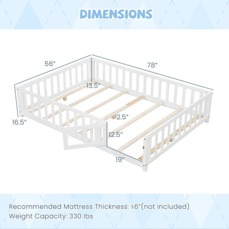 Montessori Bed Frame with Full-length Guardrails Safety Door and Latch-White