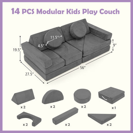 14 PCS Modular Kids Play Couch for Playroom and Bedroom-Gray