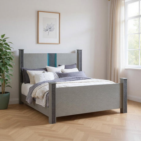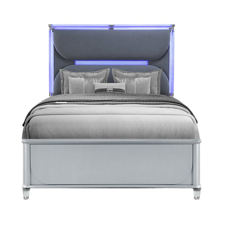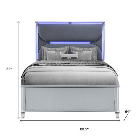 Silver and Gray Wood And Upholstery Lighted Queen Bed Frame