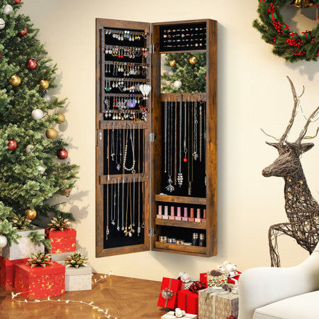 Wall or Door Mounted Jewelry Cabinet with Full-Length Mirror and LED Lights-Rustic Brown
