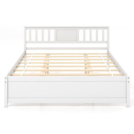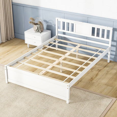 Wooden Platform Bed with Headboard and Wood Slat Support White-Queen Size