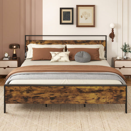 King Metal Bed Frame Industrial Platform Bed with Wooden Headboard-King Size